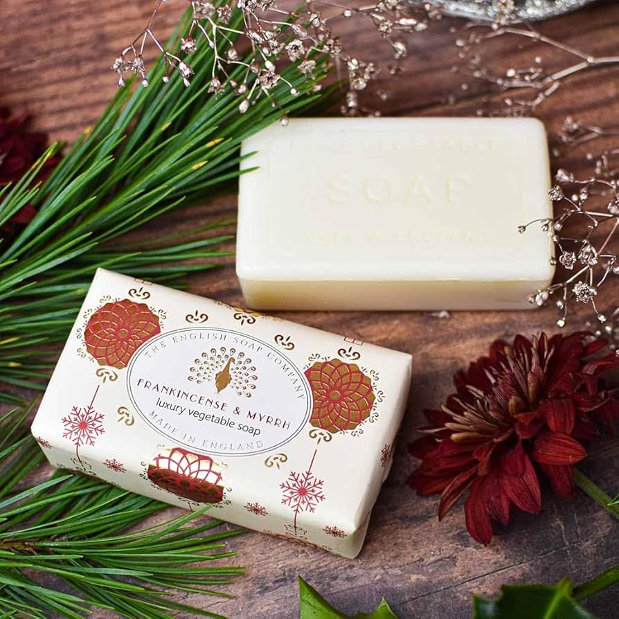 The English Soap Frankincense & Myrrh is a luxury vegetable soap enriched with shea butter, delivering a nourishing and moisturizing lather suitable for all skin types. Its festive perfume combines the warm, woody scents of frankincense and myrrh, enhancing the holiday experience while providing skin benefits. Wrapped in vintage-style festive paper, it adds a decorative touch to any seasonal setting.